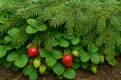 Decken Sie Erdbeerpflanzen besonders in windexponierten Lagen besser mit Fichtenreisig oder Vlies ab. Zwischen den Reihen kann Laub oder Nadelstreu vor Barfrösten schützen.